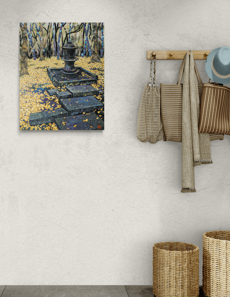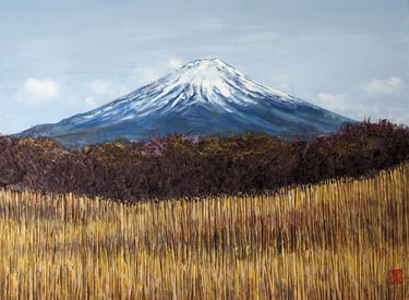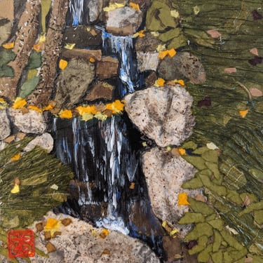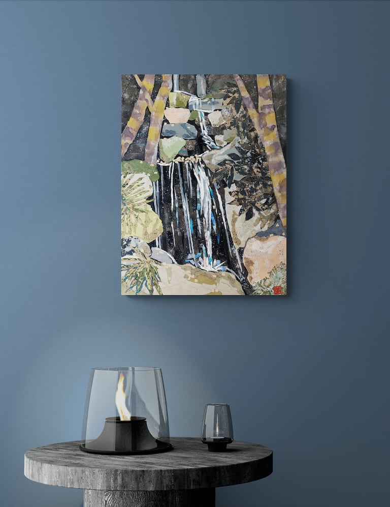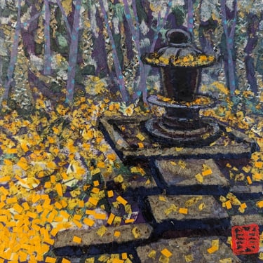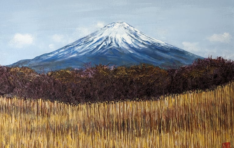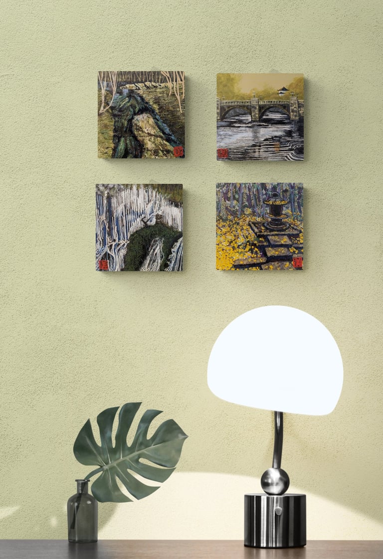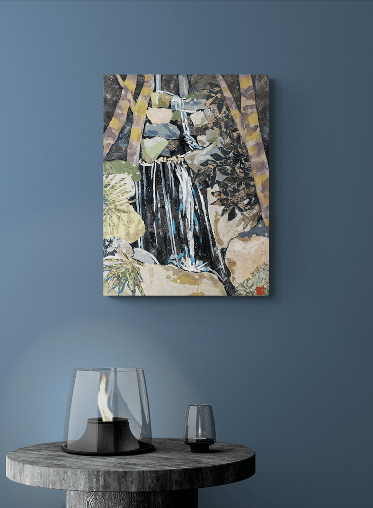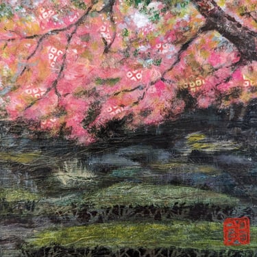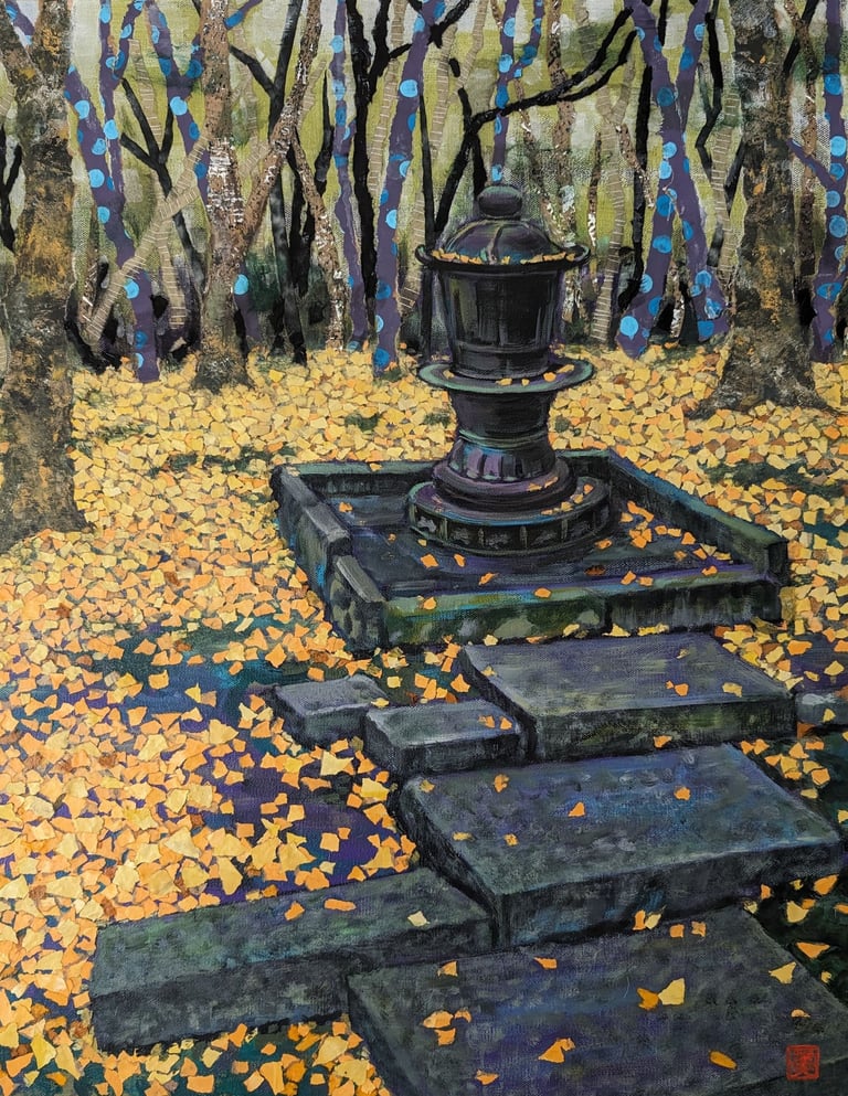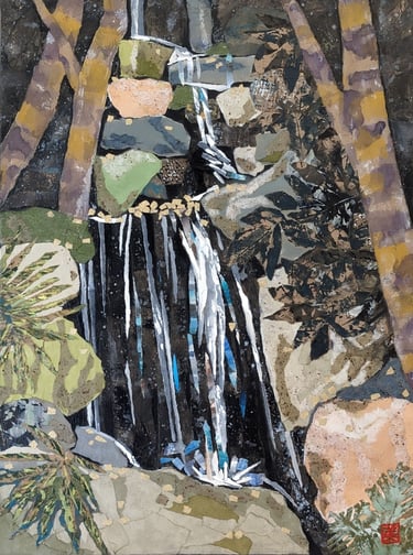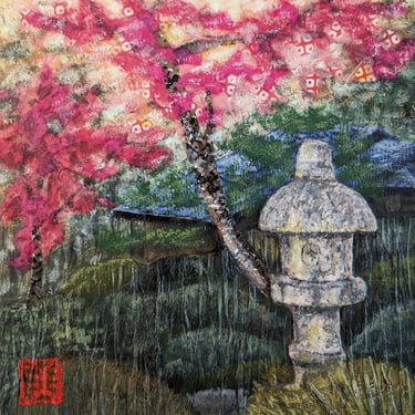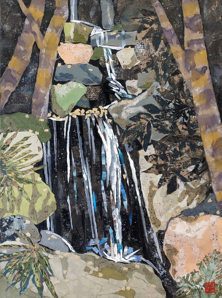 As part of my mentorship at Art on 30th, I was tasked to create a series of art pieces. This collection is a culmination of my time in Japan from 2023. This work portrays the beautiful sites I saw during my visit with my husband. Recently, I have been interested in collage and mixed media. I challenged myself to use unconventional materials such as handmade paper, washi, string, and natural fibers.