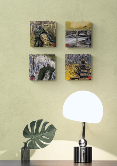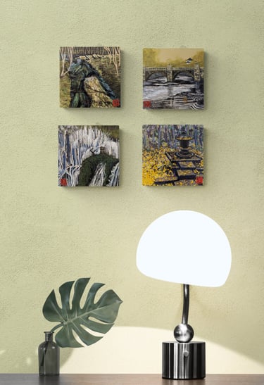 Each piece is 8 x 8 (1.5 D) on wood panels